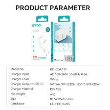 The BWOO BO-CDA119 is a 20W Type-C charger designed for fast and efficient charging. Here's a detailed overview of its specifications: Key Features
