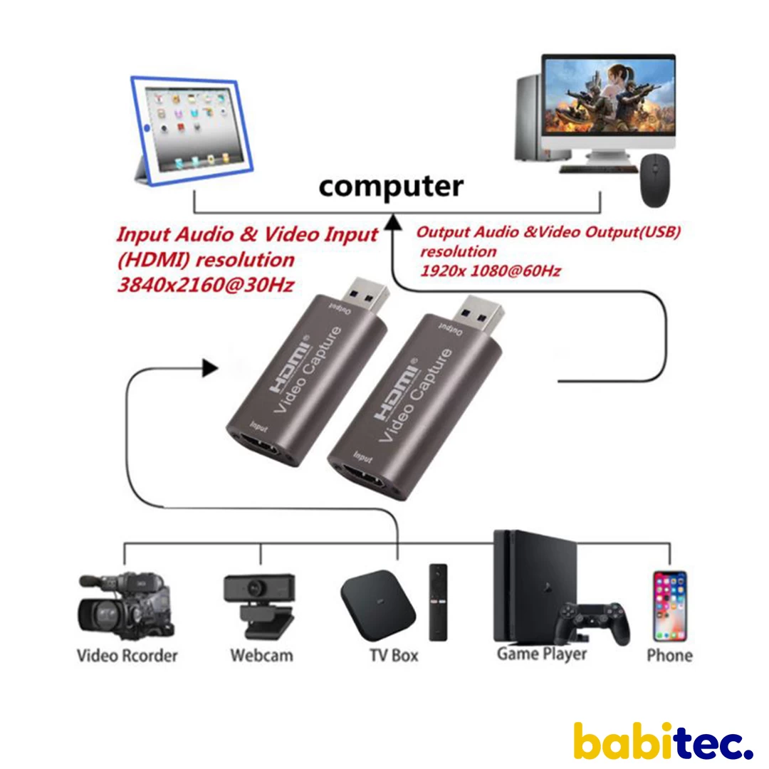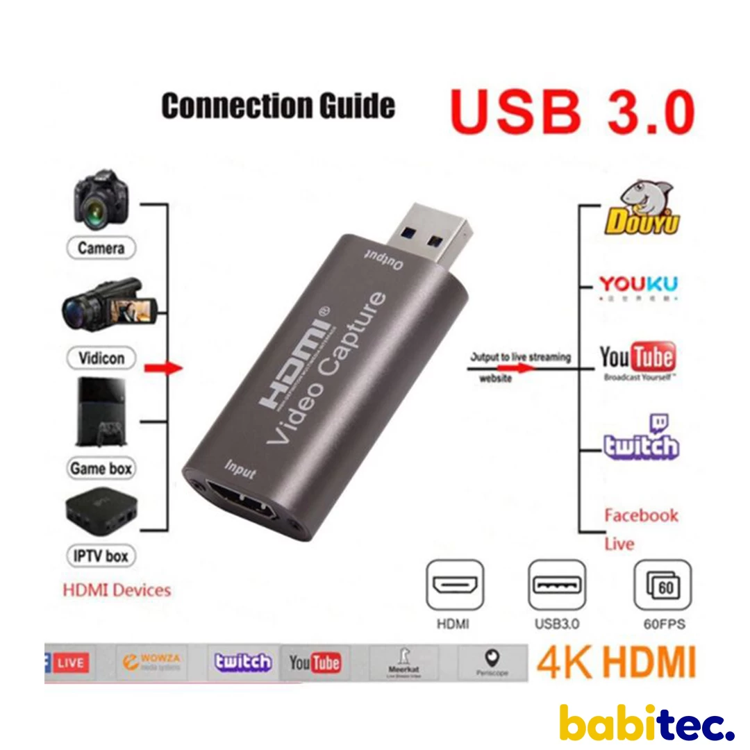 PRINCIPALES CARACTÉRISTIQUES * Supporter la résolution maximale d'entrée 3840 × 2160 @ 60Hz; * Prise en charge de la résolution maximale de sortie 1920 × 1080 @ 30Hz; * Supporte la couleur profonde 8/10/12 bits; * Supporte le câble standard HDMI AWG26: entrée jusqu'à 15 mètres, (résolution 1080P et inférieure); * Prend en charge la plupart des logiciels d'acquisition, tels que VLC, OBS, Amcap, etc; * Prise en charge de Windows, Android et MacOS; * Conforme à la vidéo USB et à la norme UVC; * Conforme à l'audio USB pour la norme UAC; * Sans alimentation externe, compact et portable. VENDU AVEC LE PRODUIT 1 * carte de capture1 * manuel d'utilisation |